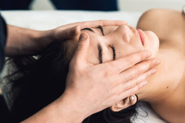 Technique manuelle réalisée sur les épaules, les trapèzes, la nuque, le cuir chevelu et le visage avec de l’huile essentielle